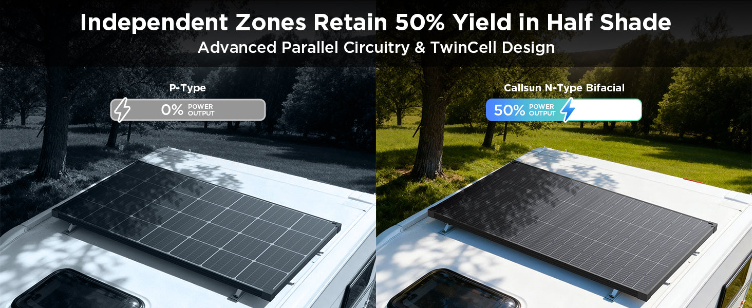 Yes. With TwinCell parallel circuitry, the panel operates as two independent sections. If one half is shaded by a vent or branch, the other half continues producing power.