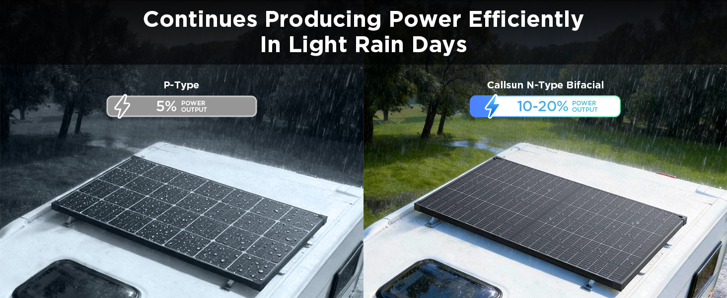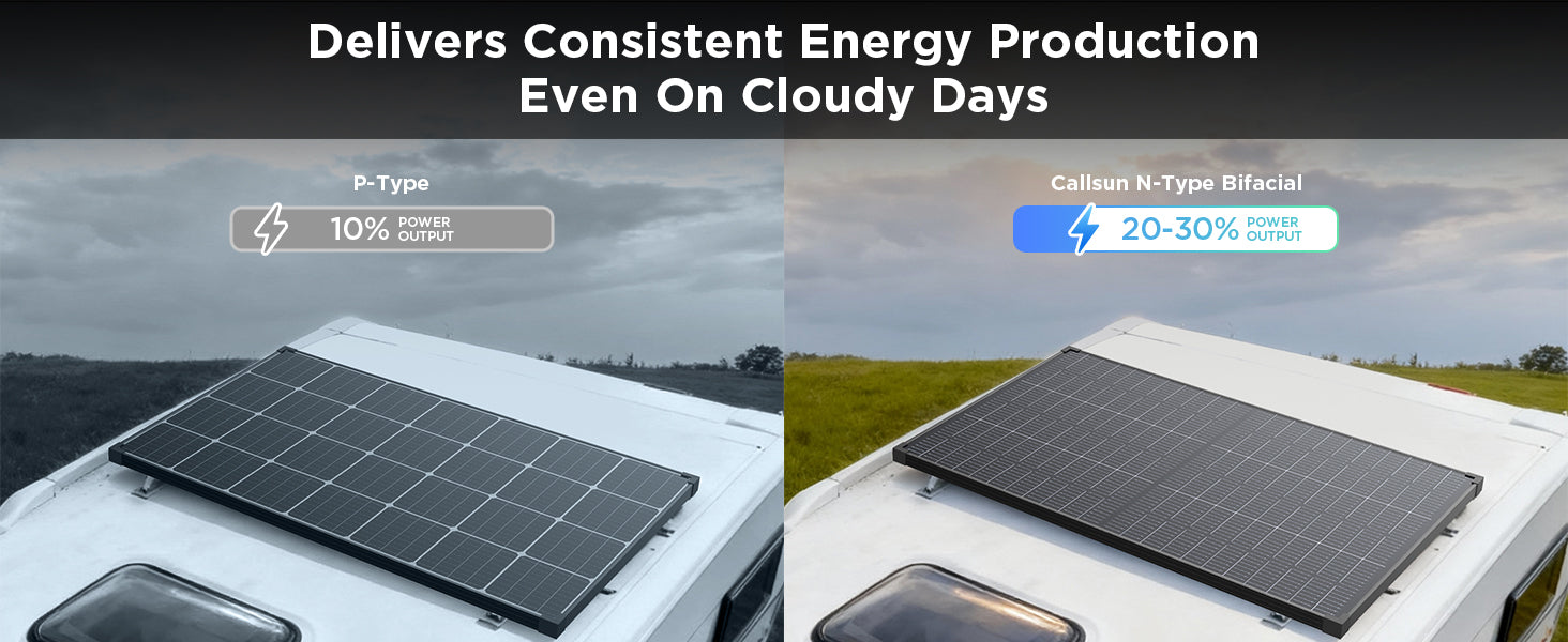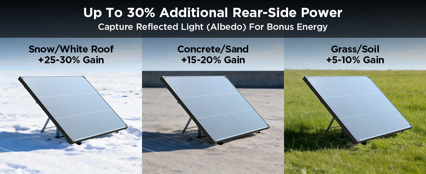 A bifacial solar panel captures sunlight from both the front and back. By collecting reflected light from surfaces like white RV roofs, sand, or decks, it can increase total energy output by up to 30%.