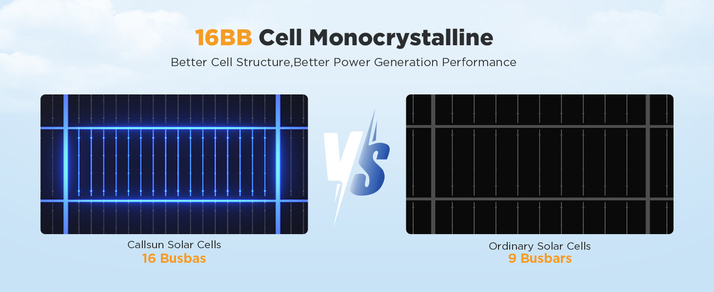 - N-Type High Efficiency | Callsun 100W solar panels use N-type cells with 25% conversion efficiency, delivering more power than conventional P-type panels.