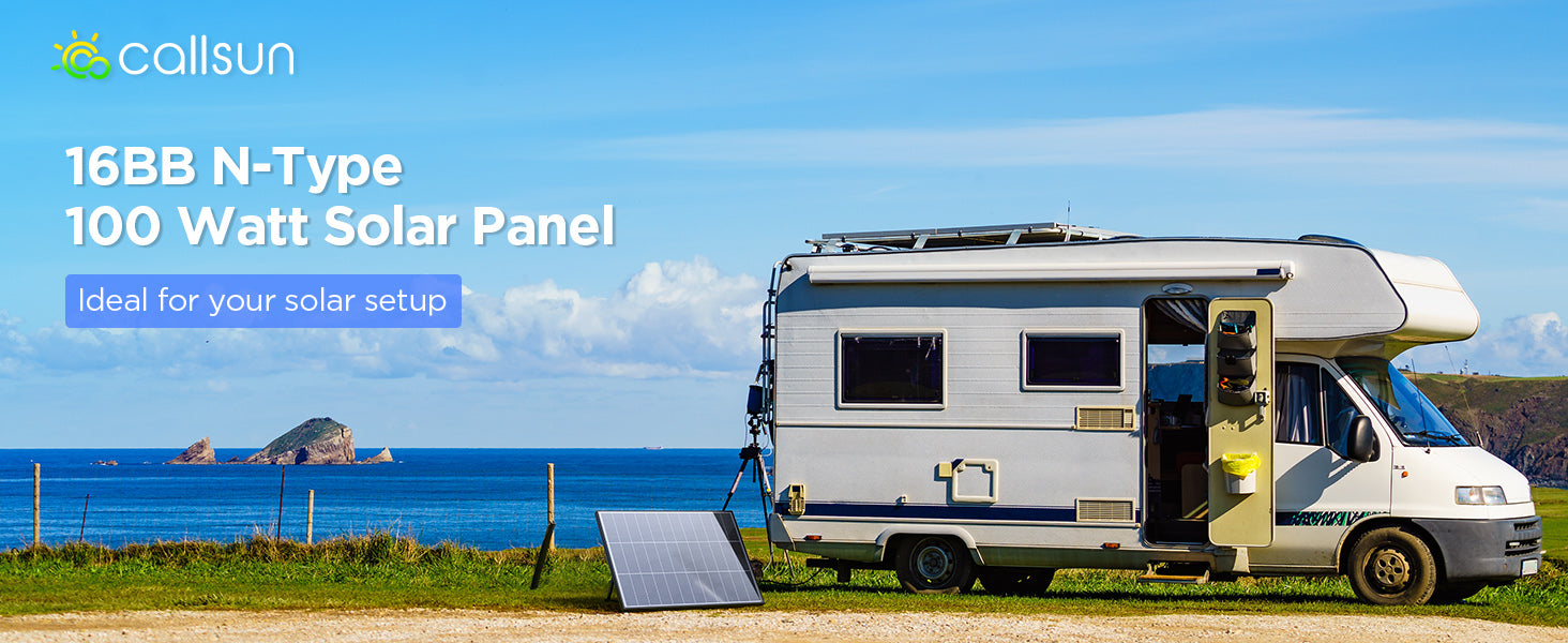 The Callsun 100W N-Type Solar Panel delivers up to 25% efficiency with advanced N-type cells and 16BB design. Compact, durable, IP68 waterproof—ideal for RV, off-grid, and mobile solar systems.