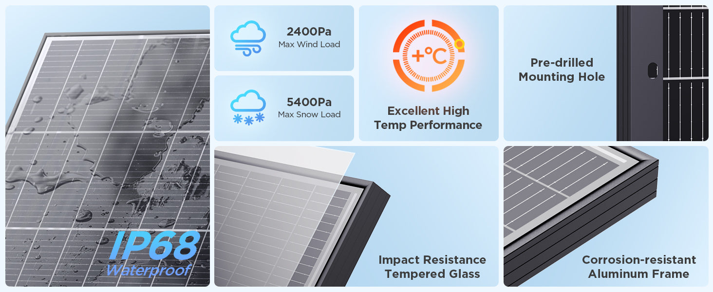 - Durable & Weatherproof | Built with low-iron tempered glass, corrosion-resistant frame, IP68 waterproof, 2400 Pa wind resistance, and 5400 Pa snow load capacity for long-lasting performance.