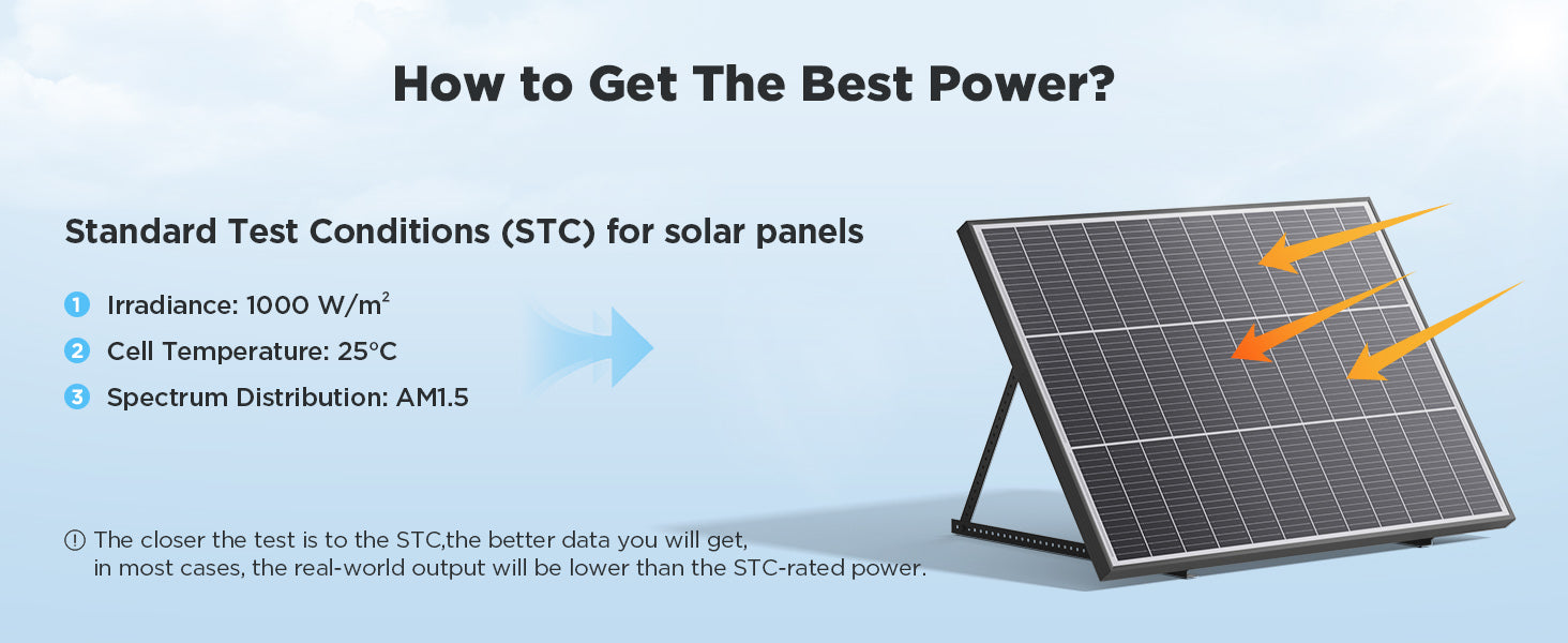 The 100W rating is measured under Standard Test Conditions (STC): ideal sunlight and temperature. In real use, sun angle, heat, shading, wiring loss, and device efficiency affect output. So power below 100W is normal and does not indicate a defect.
