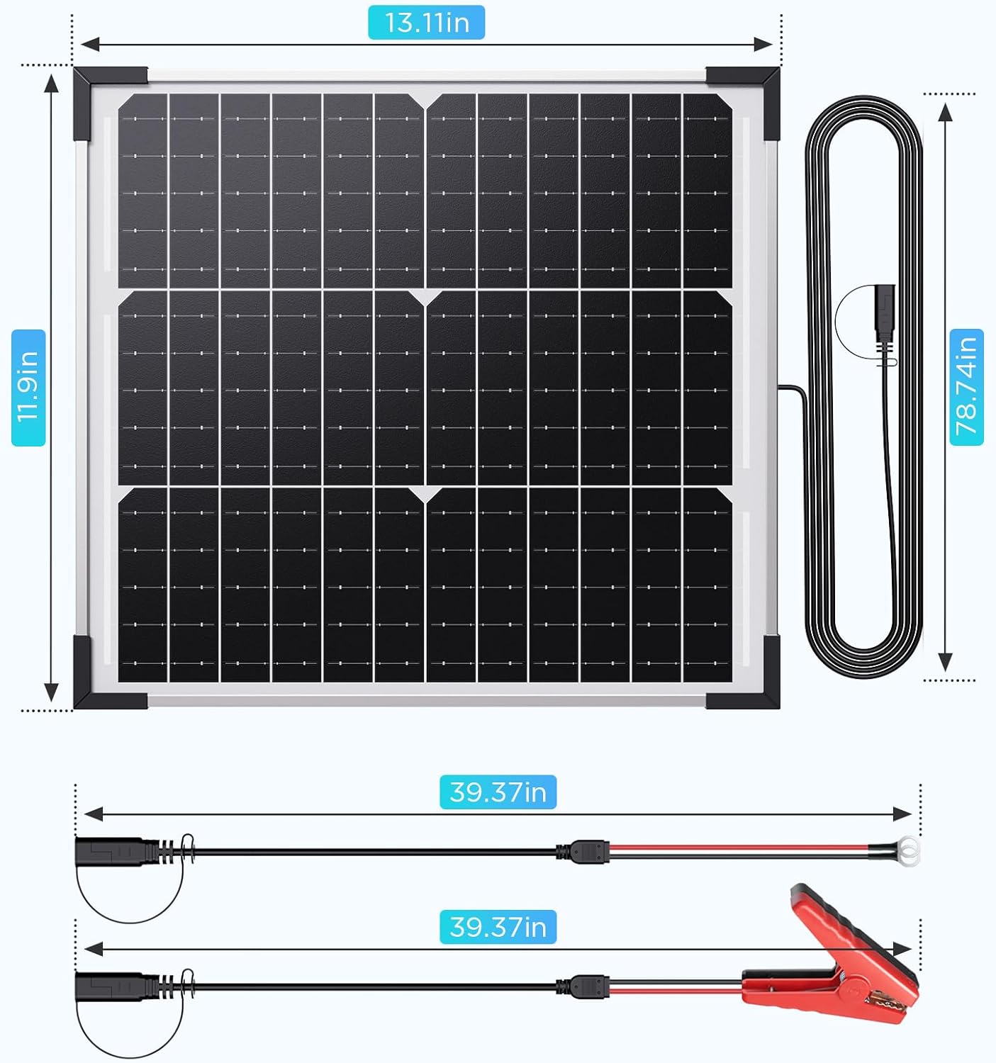 - Complete Kit & Support | What’s in the box: solar panel ×1; charge controller ×1; 360° swivel mount ×1; alligator clip cable ×1; O-rings ×1; mounting hardware kit ×1; backed by 24/7 customer support and a 365-day warranty.