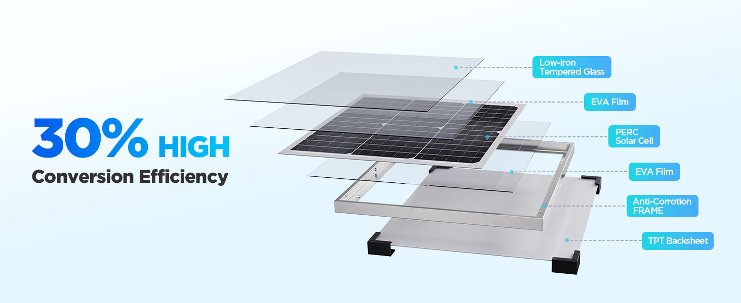 • Maximize Solar Intake | Experience up to 30% higher module efficiency with advanced SmartTrack technology. Combining Grade A+ monocrystalline cells with low-iron tempered glass, this 30W panel optimizes sunlight capture for rapid battery replenishment.
