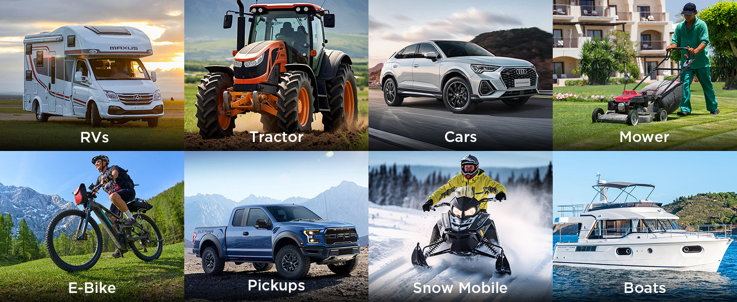 Ideal for car, RV, boat, motorcycle, camper, lawn mower, trailer, tractor, e-bike, pickup, snow mobile, and jet ski.